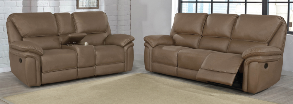 Motion sofa collection upholstered in mocha brown performance-grade coated microfiber