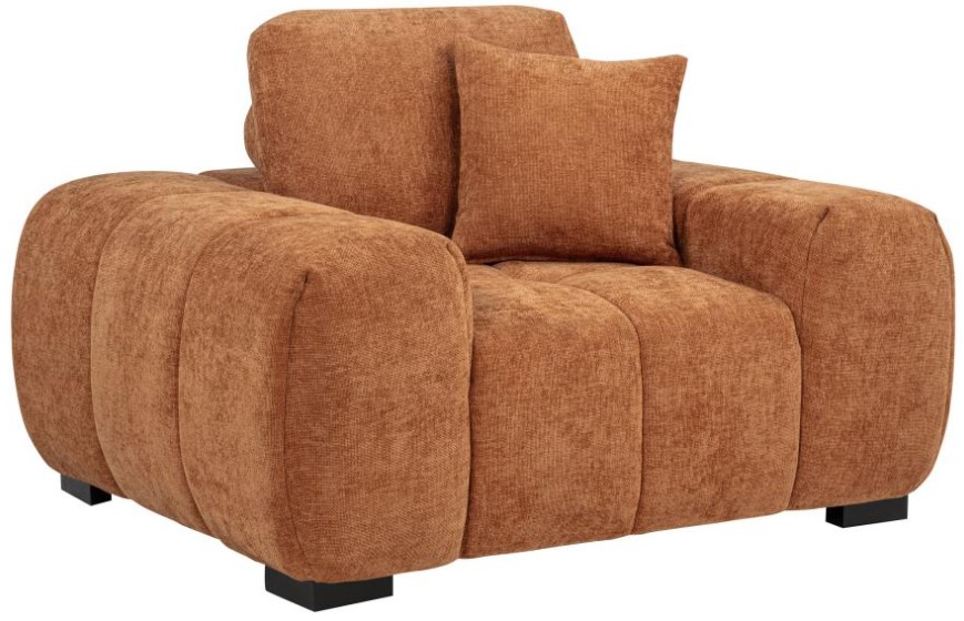 Accent chair in orange fabric features sculptural curves and deep vertical channel tufting
