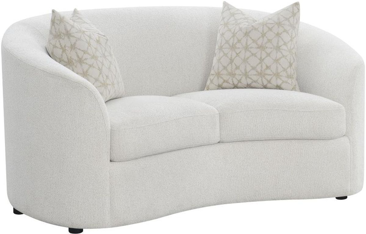 Transform your contemporary living room with this mid-century modern-inspired boucle loveseat, featuring a neutral latte boucle upholstery that presents an inviting and cozy retreat. Gracefully curved and sloped armrests, two plush cushions, and a tailored backrest complete this retro-inspired modern loveseat, supported on black round legs hidden beneath.Read More