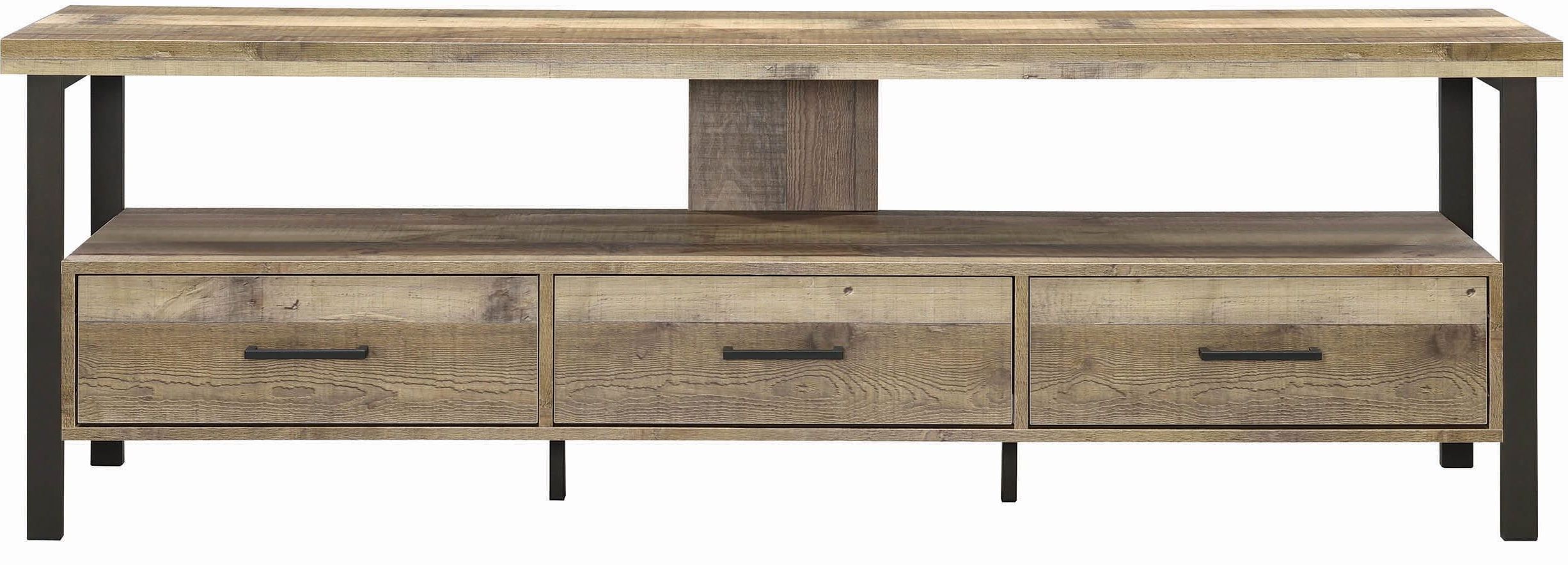 With its clean lines, black metal hardware, and warm wood finish, the Rustic Weathered Pine 71" TV Console offers a simple, classic look to complement any style of home. Three drawers and a middle shelf provide storage for blankets, toys, movies, and gaming equipment plus ample room to dress up your space with decorative accents. This piece supports a television up to 71" and 110 pounds.