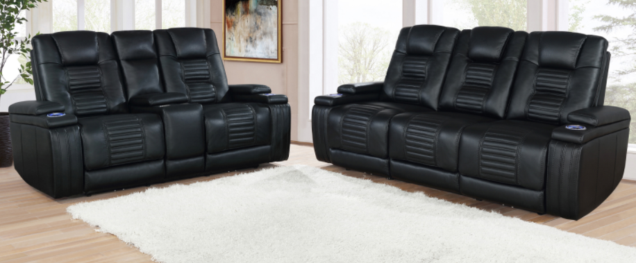 Power motion sofa collection upholstered in black performance-grade leatherette