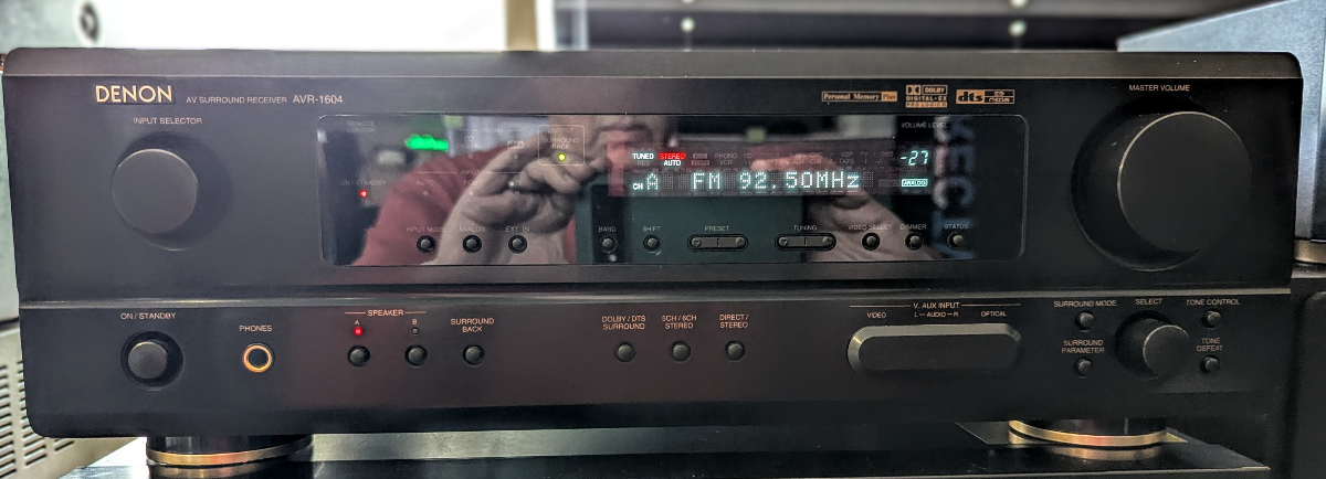 The AVR‑1604 is a mid‑2000s 6.1‑channel home theater receiver built around Denon’s high‑current amplification and a 32‑bit Analog Devices DSP engine. It delivers 75 watts x 6 into 8 ohms with full‑bandwidth, low‑distortion performance, and supports Dolby Digital EX, DTS‑ES, DTS Neo:6, and Pro Logic II, giving it full discrete 6.1 decoding plus matrix expansion for legacy stereo and surround sources. Connectivity is generous for its era, with component video switching, 3 optical inputs, 1 front‑panel, and 1 rear coax, and a full 5.1 analog input for DVD‑Audio/SACD players. The tuner section has 40 presets. The chassis uses Denon’s low‑impedance, high‑current design with banana‑compatible binding posts and dual main‑speaker outputs. A solid receiver in great condition with manual, AM antenna, and original programmable remote control.Read More