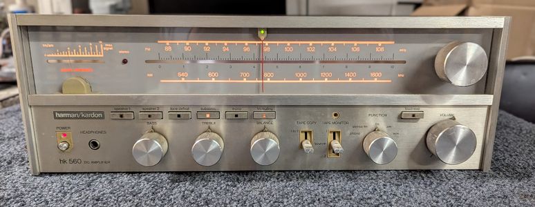 The HK 560 is a mid‑’70s stereo receiver built around Harman Kardon’s high‑current design approach, delivering strong 2‑channel performance with a warm, detailed presentation. It’s rated at roughly 45 watts per channel into 8 ohms, with plenty of headroom and a terrific phono stage for turntable setups. The layout is straightforward, with solid analog controls, a large signal meter, and a clean brushed‑aluminum faceplate that reflects the era’s build quality. Rear‑panel connections include multiple line‑level inputs, tape loops, and standard speaker outputs for 2 pairs. This is serious vintage--it sounds great, and everything works...2 indicator lamps are out...aside from that, mint!Read More