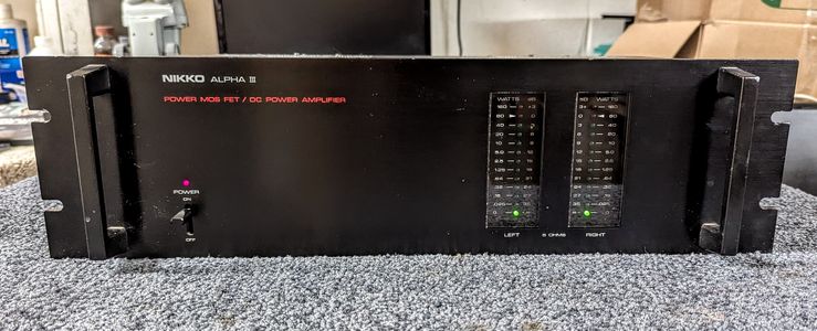 The Alpha III is a 100‑watt‑per‑channel early‑80s power amplifier built around a fully discrete output stage and a high‑current supply that gives it the smooth, slightly warm Nikko signature with excellent control on real‑world speakers. This unit is fully functional, with both power meters operating as designed and no electronic modifications or recap work performed. Cosmetics show a few small paint dings but no scratches, keeping the faceplate and overall presentation solid for its age. Rear connections and controls are intact, and the amp runs cleanly into load with proper protection behavior. Sounds really good!Read More