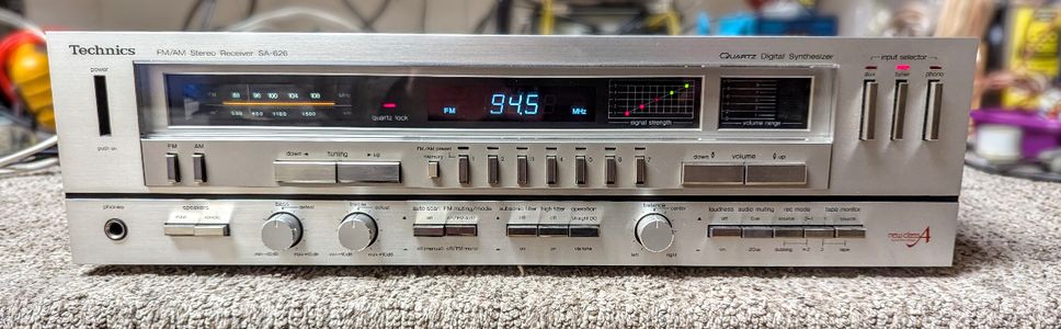 The SA‑626 sits with early‑80s silver‑face receivers where the company was blending clean styling with truly robust amplifier sections. It’s a mid‑line model from around 1982–1983, delivering roughly 55 watts per channel into 8 ohms with Technics’ characteristic low‑distortion Class AB design and a tuner section that was considered excellent. The faceplate layout is classic Technics: wide tuning dial, beefy knobs, and a symmetrical aesthetic. Inside, it uses a discrete output stage, a solid power supply, and a phono preamp that performs well. The large transformer allows for plenty of all-day power + any peak demands. This vintage-ish unit works very well with 1 idiosyncrasy: power button failed and the owner wired a toggle switch on the side of the chassis--looks funny, works fine.Read More