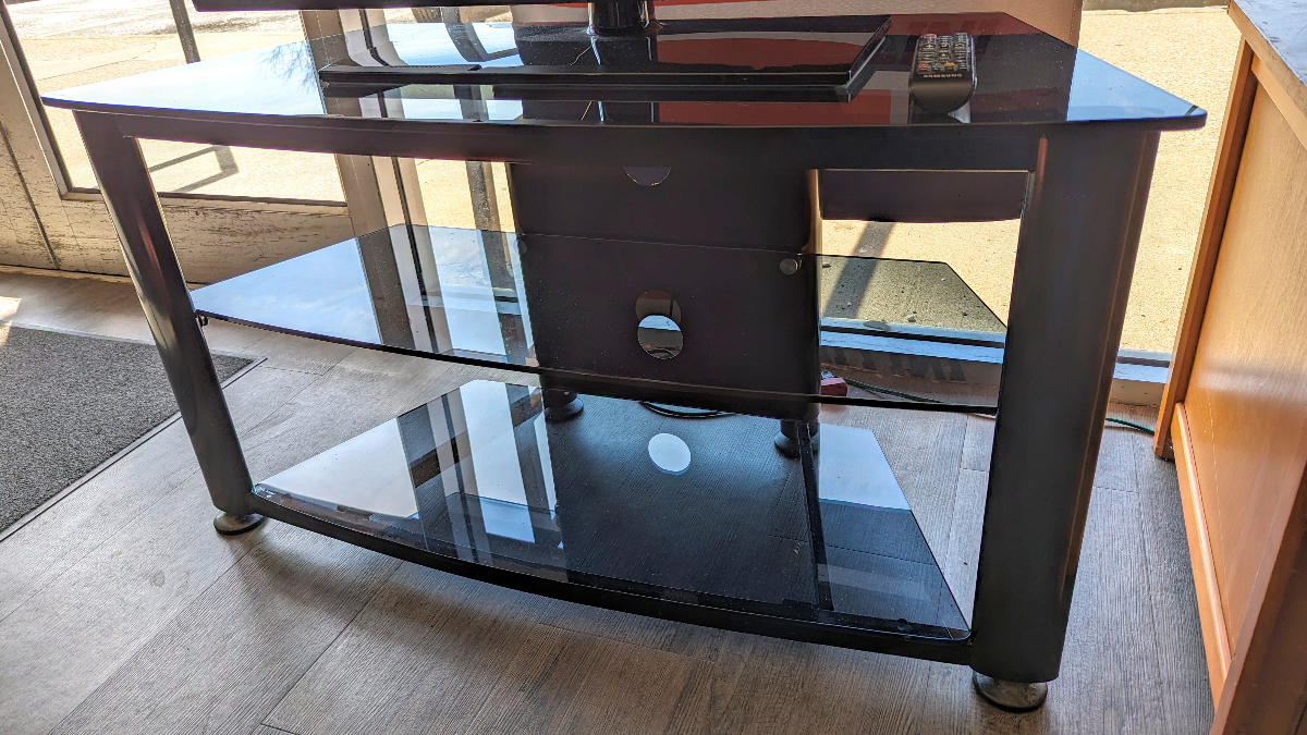Metal & tempered glass construction, this is a mid-sized stand perfect for 42-55" TV but sturdy enough for larger sets (they would just hang over the edges). It came from an estate--brand unknown but in very good condition. 22" high with 3 shelves, 42" wide at the front of top shelf and tapered so it works well in a corner placement.Read More